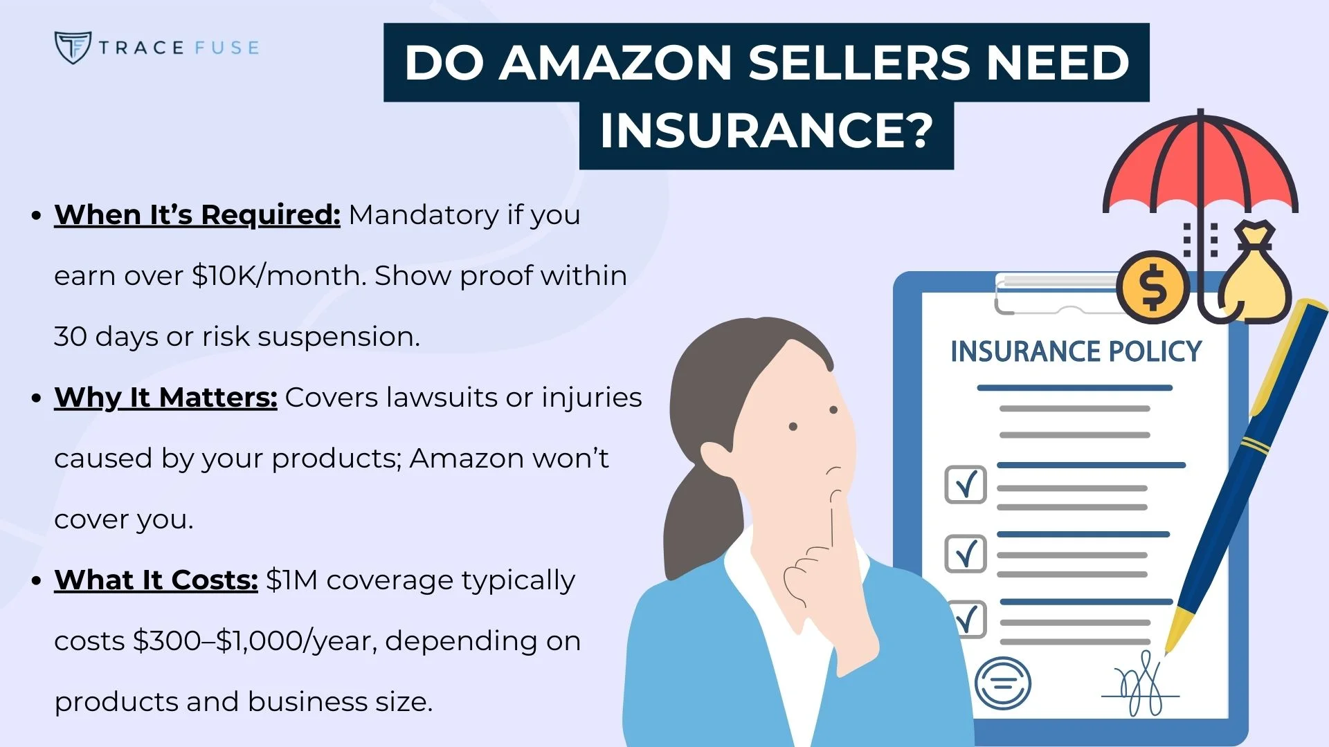 If your monthly Amazon revenue is $10,000 or more, seller insurance is mandatory. Once you cross the revenue threshold, you’re required to have $1 million worth of commercial general liability coverage, which typically costs between $300 and $1,000 annually. Otherwise, you could face account penalties or suspensions.